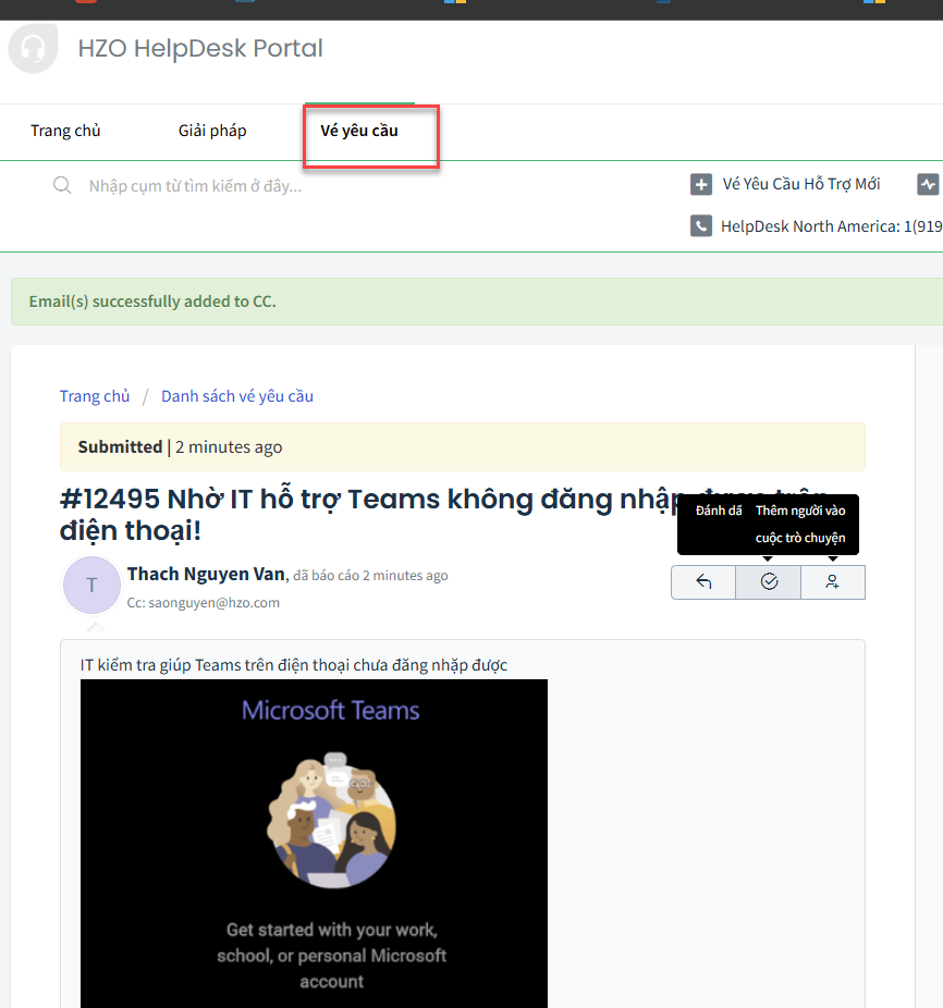 4. Bạn có thể tương tác với nhân viên hỗ trợ vé này qua email hoặc ngay trên portal: