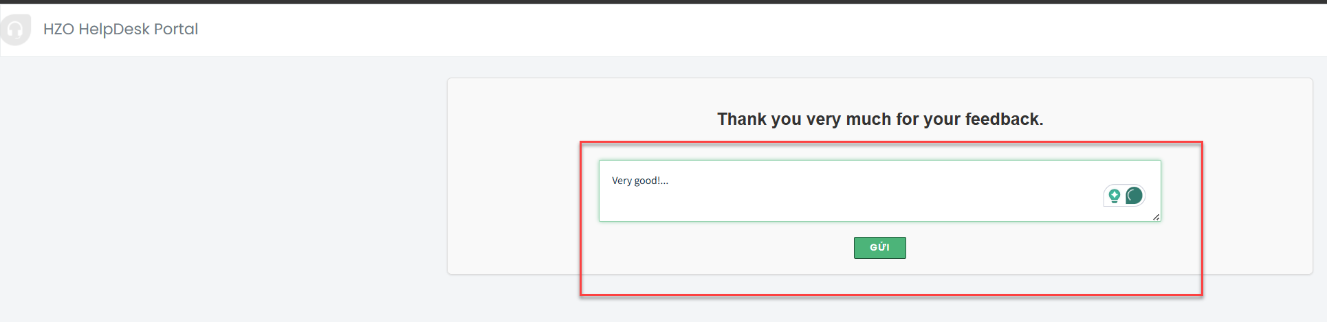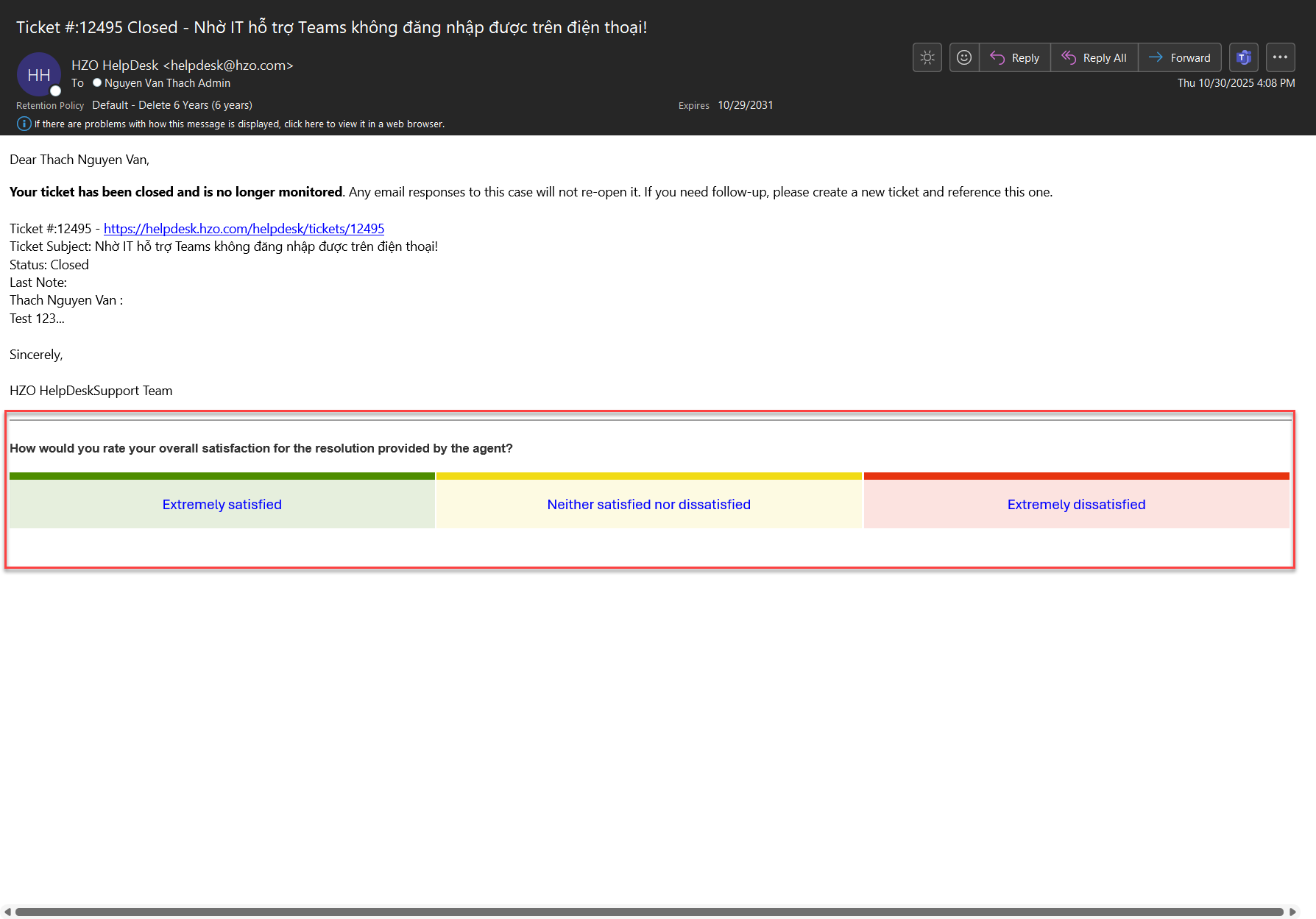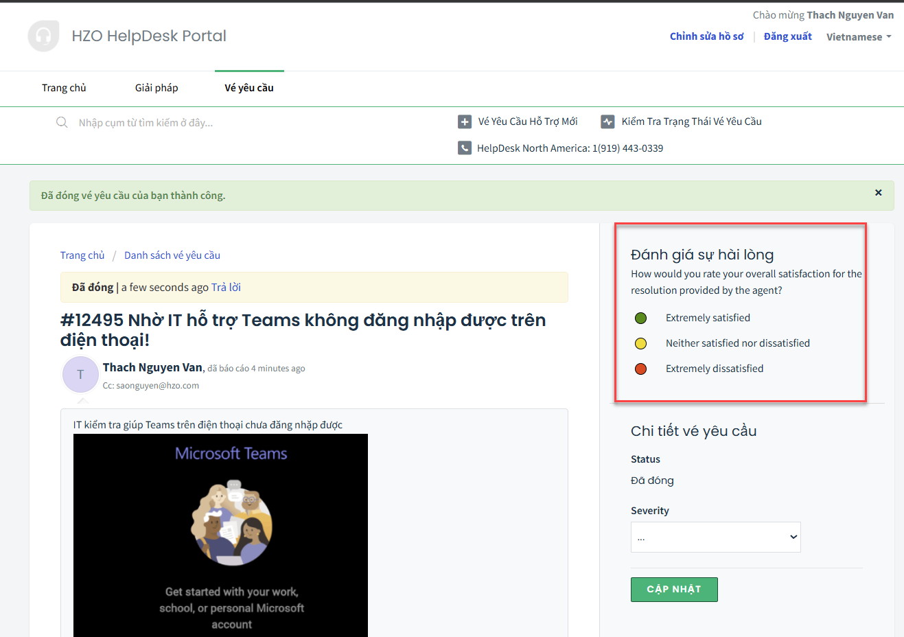 5. Sau khi vé đã hoàn thành bạn có thể đánh giá mức độ hài lòng của bạn cho nhân viên hỗ trợ vé này. Qua email hoặc ngay trên portal.